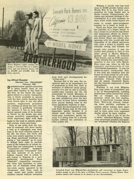 The American Dream is the powerful idea that an individual can experience success and freedom in this nation through diligent work. In the 40s and 50s, many believed homeownership was the main reward of this American dream, and that suburban communities gave Americans the opportunity of homeownership to live the ideal life. However, many seemed to use this “dream” as a way to root in institutionalized racism into the housing process. Buying a house was a brutal process for a black person in the 50s, and was purely set to give black buyers major disadvantages in the mortgage process. Levitt & Sons was one of the suburban development companies that strived to create the ideal suburban communities during the 50s. This specific company was the face of mass suburbanization in the 50s, making 30 houses per day at only 9,000 each. Despite their glory, they implanted racism into their Levittown (communities made by Levitt and Sons) community values by preventing black people from buying their houses altogether. According to the FHA, racially integrated communities were “difficult to manage” and “unstable,” and perfect suburbia was to be made up of only white people. But how can a place be a utopia if it is not inclusive? Morris Milgrim stood up against these racial boundaries and tried to create a place almost identical to the Pennsylvania Levittown and only 8 miles away. But here, everyone was included, and it was truly a utopian dream. This dream was achieved by a specific quota of 45% black people and 55% white people that made up Milgram’s community known as Concord Park.